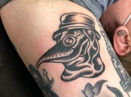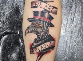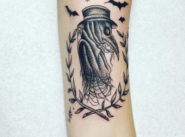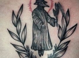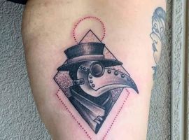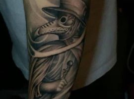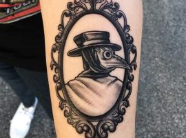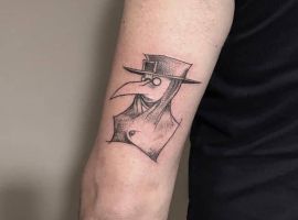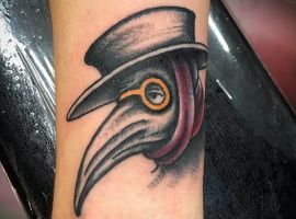 Чумний доктор татуювання на шкірі уособлює долю і проведення. Він підходить тим, хто вірить в долю і фатум, в те, що все визначено і від нас не залежить.