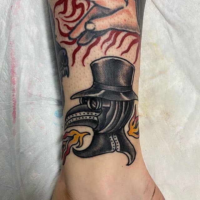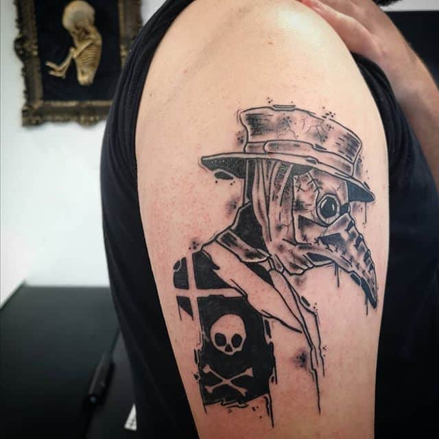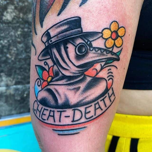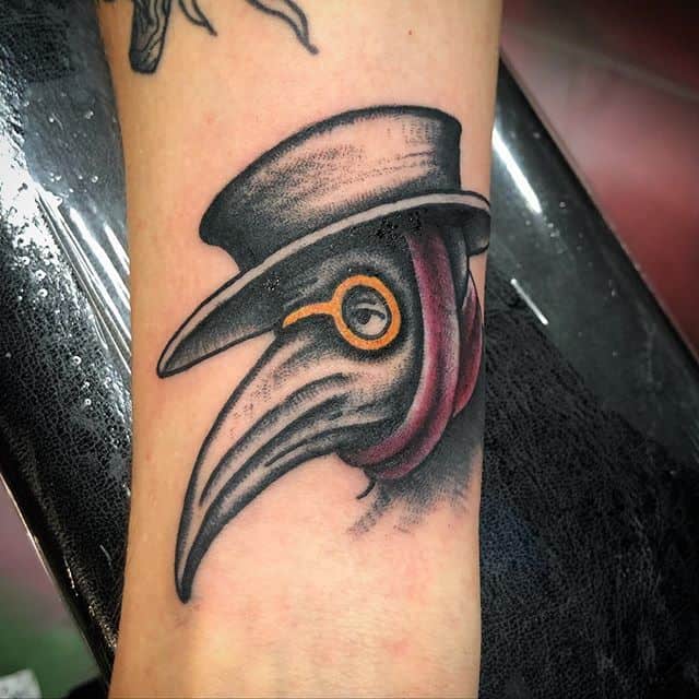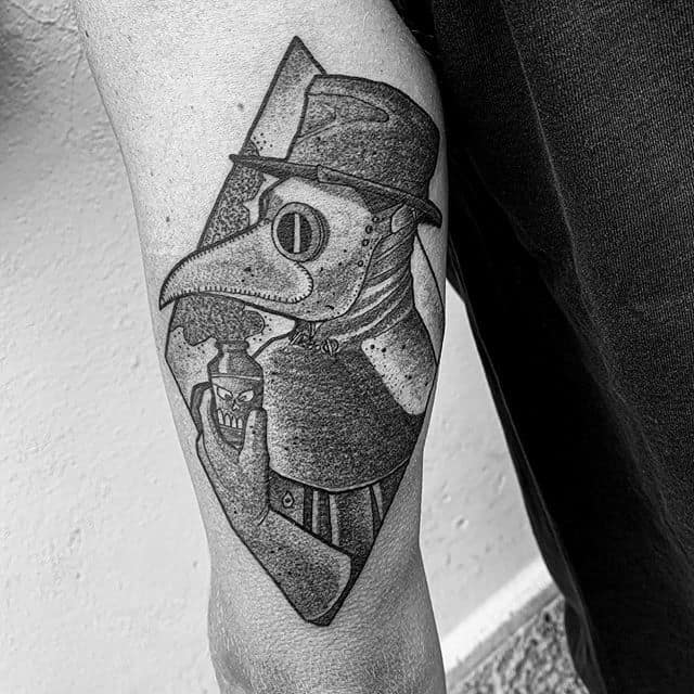Чумний доктор татуювання на шкірі уособлює долю і проведення. Він підходить тим, хто вірить в долю і фатум, в те, що все визначено і від нас не залежить.
