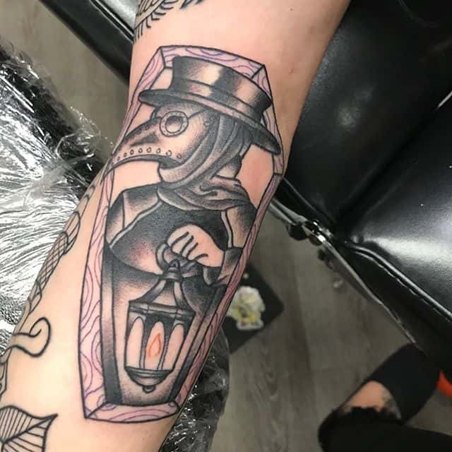 Звичайно, цю ідею майже ніколи не вибирають дівчата. Це більш чоловічий образ, в силу своєї серйозності і похмурості. Виконувати його в мініатюрному вигляді також не логічно. Під чумного доктора логічно виділити рівну і об’ємну частину тіла. Найкраще підійде передпліччя, плече або гомілка. Також можна нанести на плече, стегно, груди або спину. Найсміливіші зображують голову персонажа на шиї.