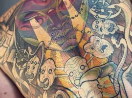Це унікальні барвисті масштабні роботи, що несуть глибокий сенс. Основа кольорового татуювання в техніці Орієнтал – східні мотиви. Це симетричні повторювані візерунки в поєднанні із зображеннями граціозних гейш, мужніх самураїв, ширяючих в польоті драконів, коропів, що приносять удачу. Ключові кольори: чорний, червоний, жовтий, зелений.