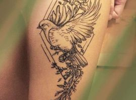 Дуже витончено виглядають силуети пташок або пір’їнка. Значення таких малюнків буде залежати від їх візуального рішення. Милі ластівки або колібрі підкреслять романтичну, мрійливу натуру своєї власниці, її внутрішню легкість і дружелюбність. Те ж значення буде нести ніжне перо. А ось пишний кольоровий Павич – символ розкоші, багатства і достатку. Також часто наносять зображення голуба, який говорить про внутрішню чистоту і прагнення до духовності і доброти.