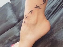 На щиколотці витончено виглядають маленькі жіночі написи, зірочки з Місяцем, птиці, риби з плавниками, силуети котячих.