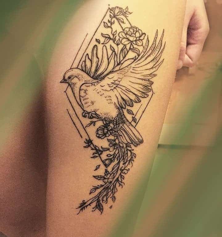 Дуже витончено виглядають силуети пташок або пір’їнка. Значення таких малюнків буде залежати від їх візуального рішення. Милі ластівки або колібрі підкреслять романтичну, мрійливу натуру своєї власниці, її внутрішню легкість і дружелюбність. Те ж значення буде нести ніжне перо. А ось пишний кольоровий Павич – символ розкоші, багатства і достатку. Також часто наносять зображення голуба, який говорить про внутрішню чистоту і прагнення до духовності і доброти.