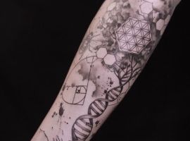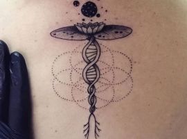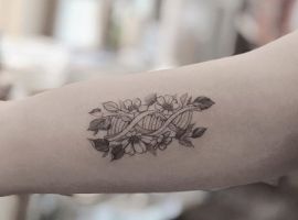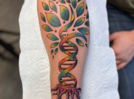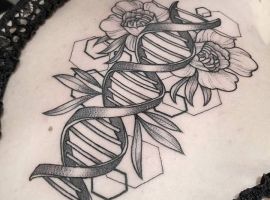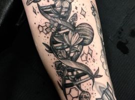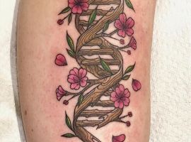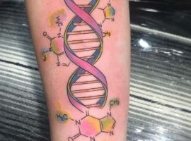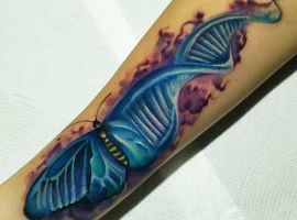 Молекула ДНК буде мати гарний вигляд з написами, виконаними каліграфічними плавними літерами. Так як ДНК – це символ життя, то гарною ідеєю буде нанести її разом з маленькими малюнками живої природи: комахами, квітами і т.д., з іншими молекулярними структурами. Якщо робите татуювання ДНК, щоб висловити гордість за свою спадщину, можете включити в дизайн імена або ініціали.