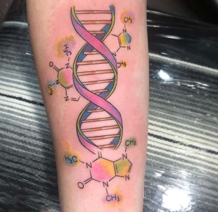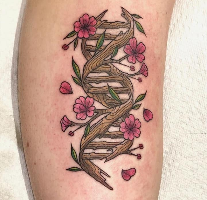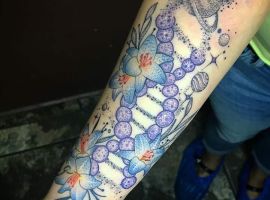 Молекула ДНК буде мати гарний вигляд з написами, виконаними каліграфічними плавними літерами. Так як ДНК – це символ життя, то гарною ідеєю буде нанести її разом з маленькими малюнками живої природи: комахами, квітами і т.д., з іншими молекулярними структурами. Якщо робите татуювання ДНК, щоб висловити гордість за свою спадщину, можете включити в дизайн імена або ініціали.