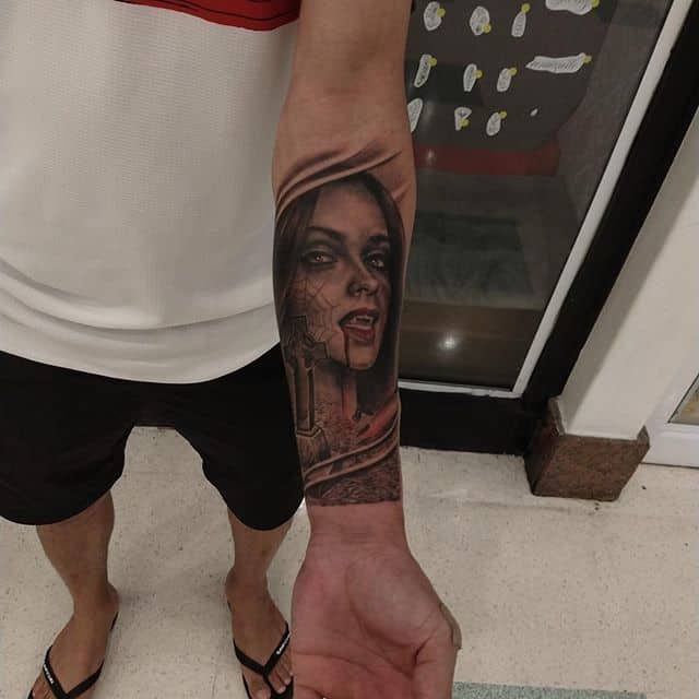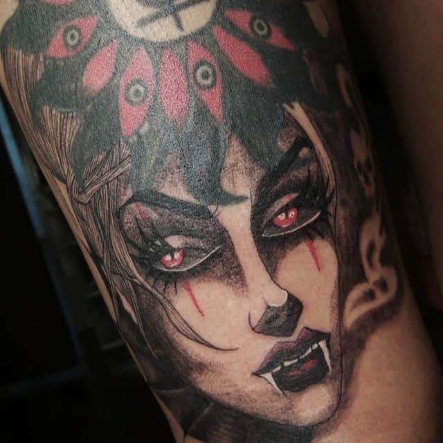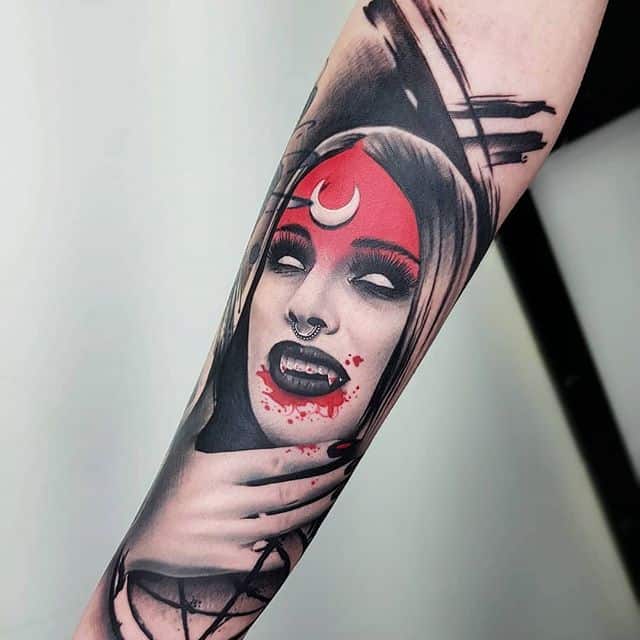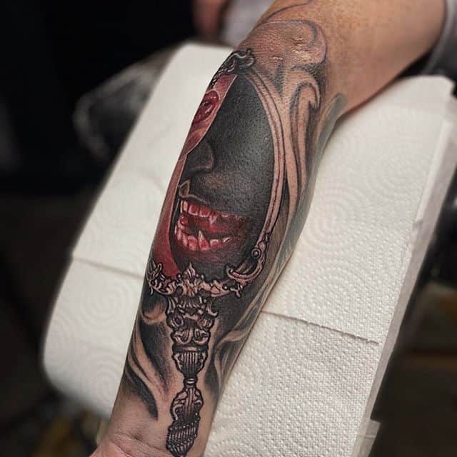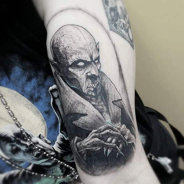 Швидше за все, людина, що наважилася набити собі татуювання Вампір є фанатом містичних фільмів і серіалів, книг на цю тему. Трапляється, що власники тату вибирають в якості ескізу портрет конкретного актора, що зіграв чудовисько в фільмі. Безумовно, такі натільні малюнки будуть приваблювати своєю мальовничістю і екстравагантністю. Переважаючими кольорами в тату будуть кривавий червоний і чорний.