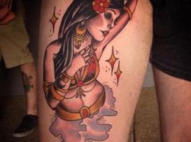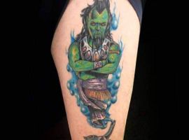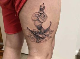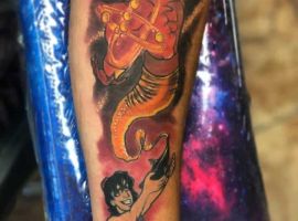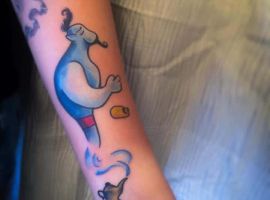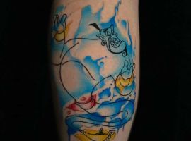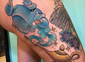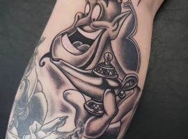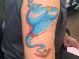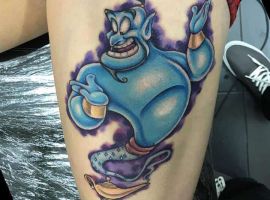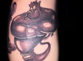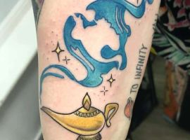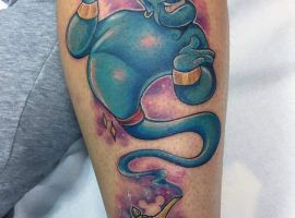 Таким чином, значення татуювання, на якому зображений джин, часто уособлює прагнення володаря заволодіти неординарними здібностями. Образ набув широкого поширення в культурі через харизму і доброзичливий характер мультяшного героя, який вилітає з лампи і виконує 3 бажання. Замовте неповторний ескіз у досвідченого майстра тату-салону Альянс в Києві.