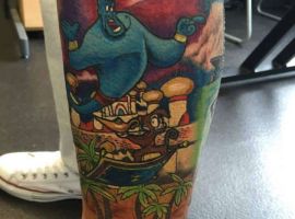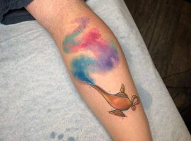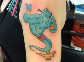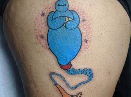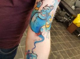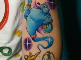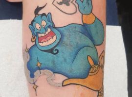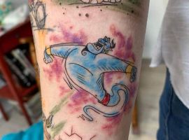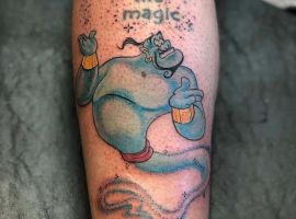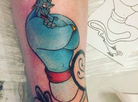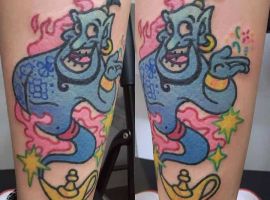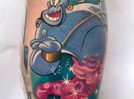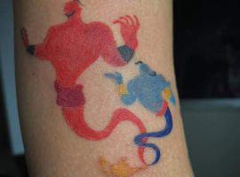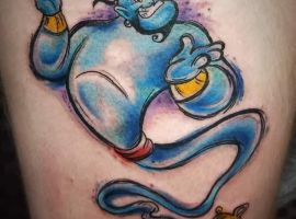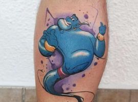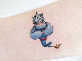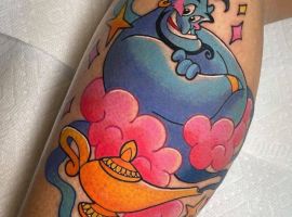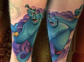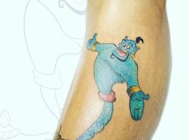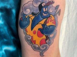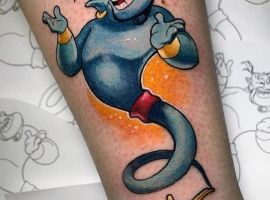 У мультяшній техніці набиваються прості ескізи без потайних смислів. Послання подібного малюнка на тілі зможе розшифрувати кожен бажаючий. Даний стиль відрізняється яскравими фарбами, що особливо підходить для зображення джина.