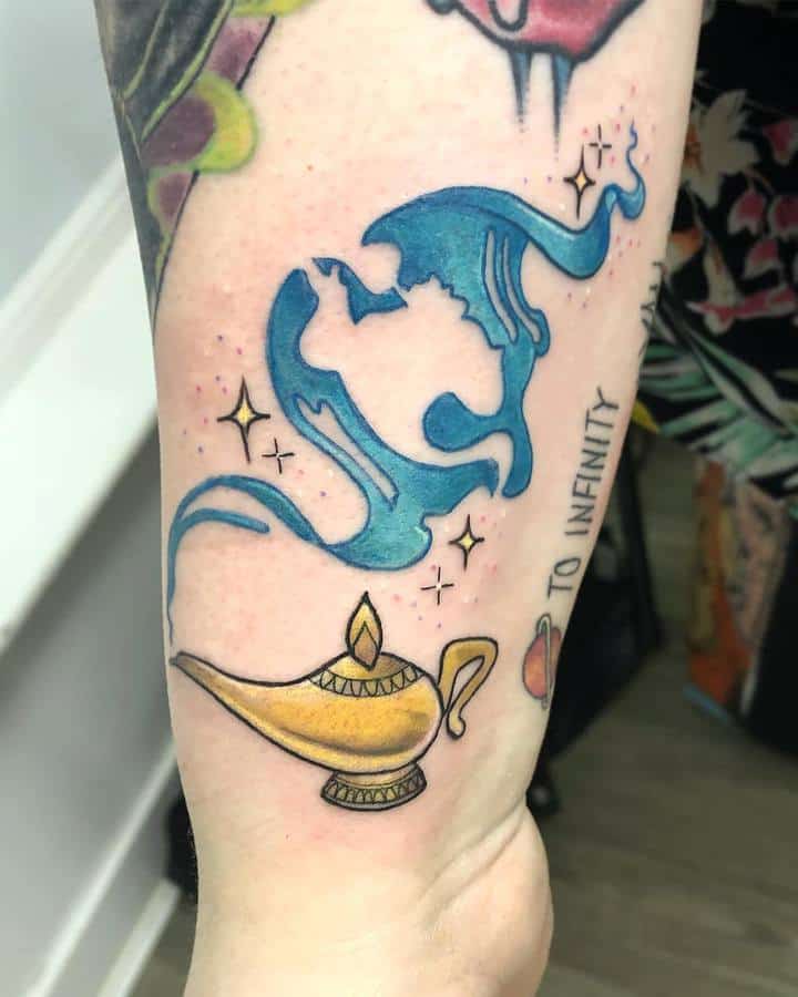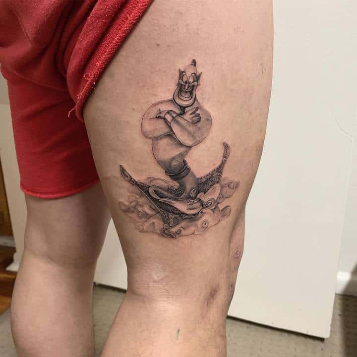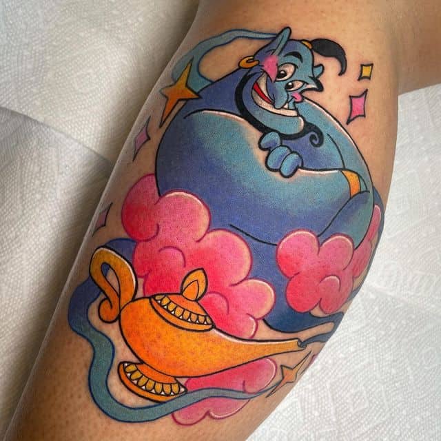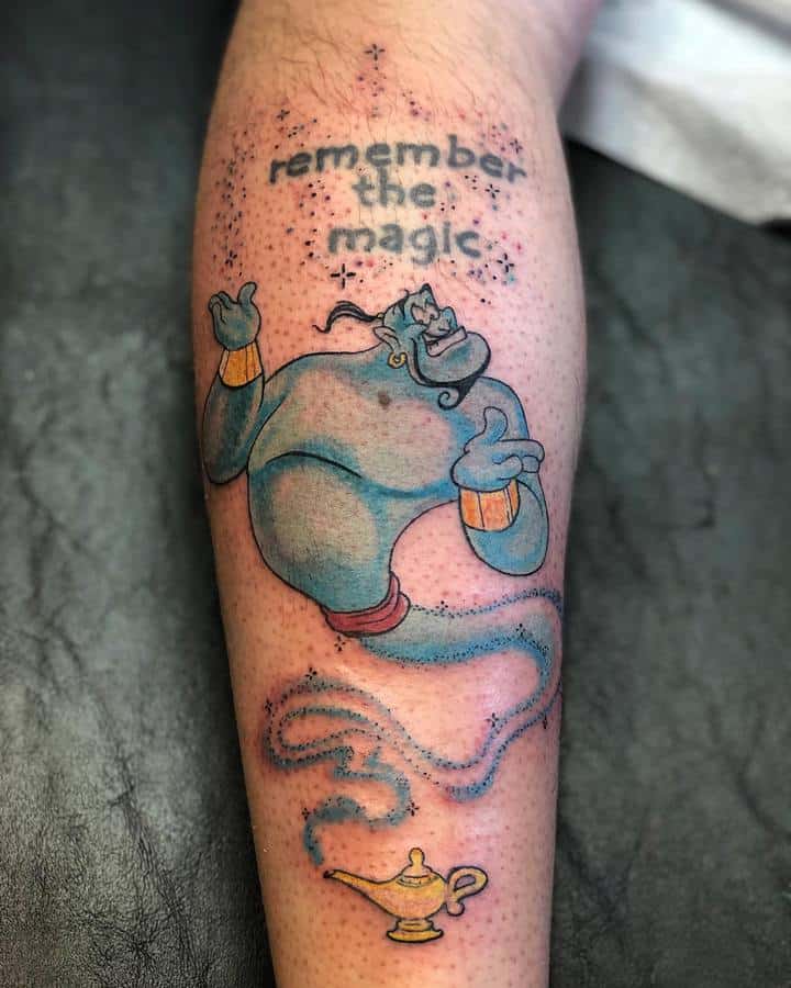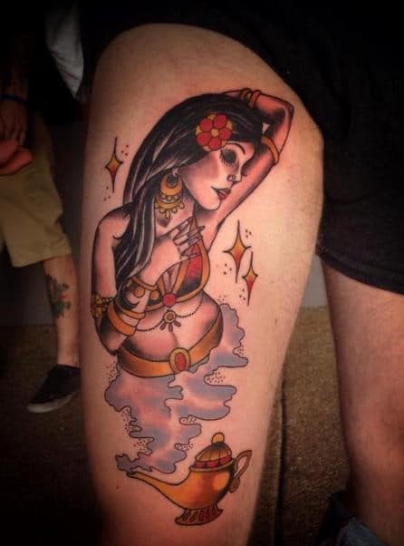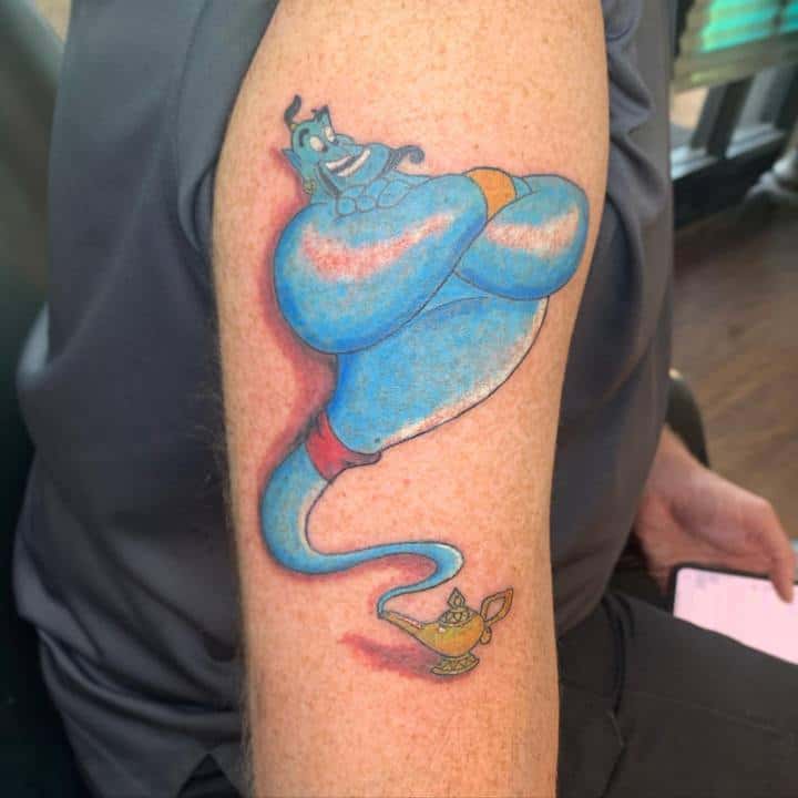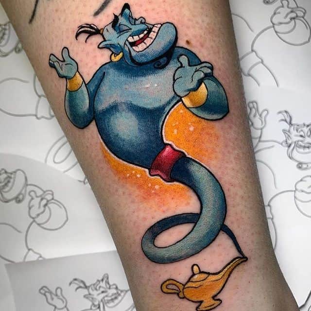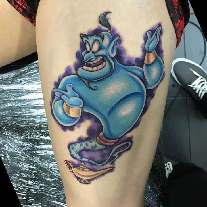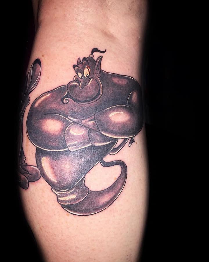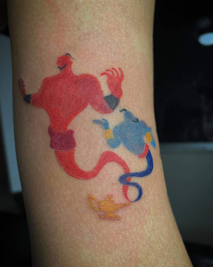 Вибір на користь даного героя обумовлений тим, що Володар натільного малюнка прагне бути схожим на улюбленого персонажа з дитячих спогадів. Людина хоче перейняти риси характеру, властиві харизматичному казкарю. Татуювання джин набивають також ті, хто вважає себе фанатом мультфільму про Алладіна.