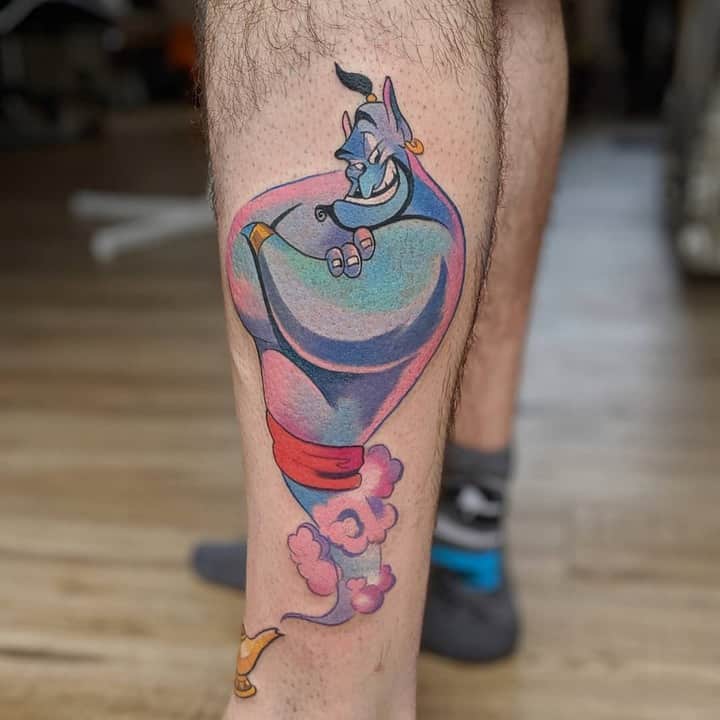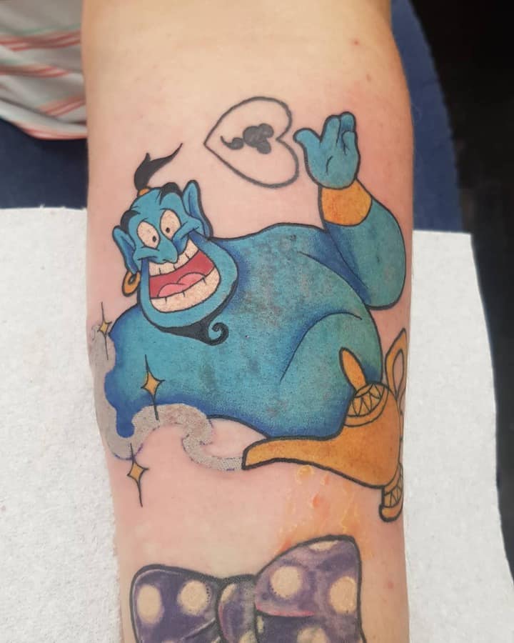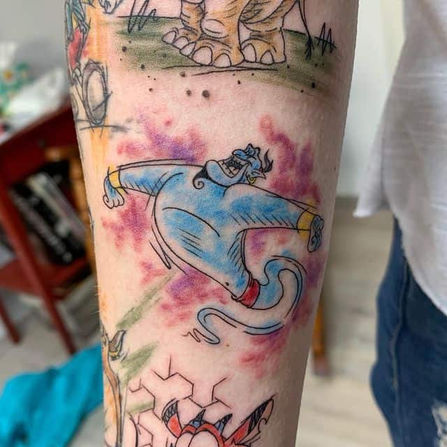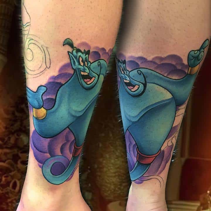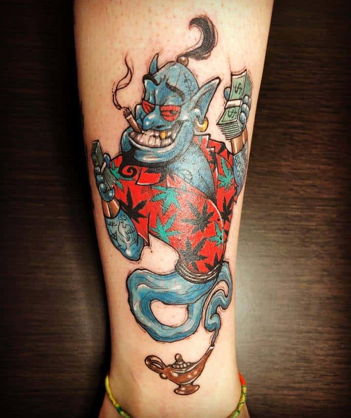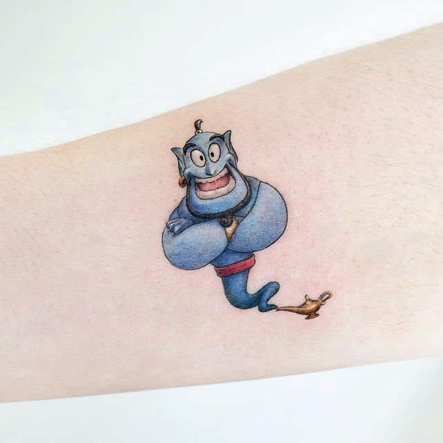 У мультяшній техніці набиваються прості ескізи без потайних смислів. Послання подібного малюнка на тілі зможе розшифрувати кожен бажаючий. Даний стиль відрізняється яскравими фарбами, що особливо підходить для зображення джина.