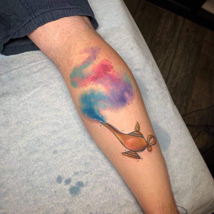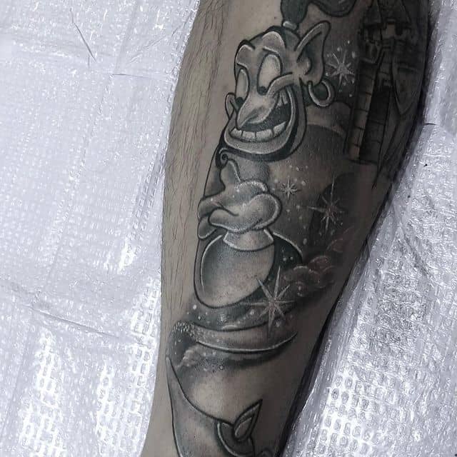 Таким чином, значення татуювання, на якому зображений джин, часто уособлює прагнення володаря заволодіти неординарними здібностями. Образ набув широкого поширення в культурі через харизму і доброзичливий характер мультяшного героя, який вилітає з лампи і виконує 3 бажання. Замовте неповторний ескіз у досвідченого майстра тату-салону Альянс в Києві.