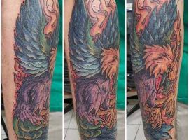 Звичайно ж, найкраще татуювання фенікс або Жар птиця буде виглядати в кольоровому варіанті. Яскраві червоні, жовті та оранжеві язики полум’я на тілі не зможуть залишитися без уваги. При цьому чорно-білі ескізи зустрічаються так само часто.