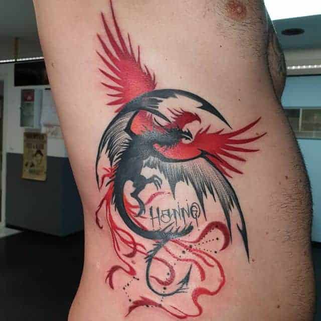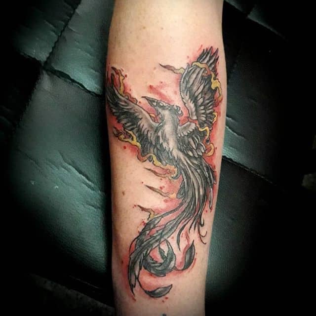 Звичайно ж, найкраще татуювання фенікс або Жар птиця буде виглядати в кольоровому варіанті. Яскраві червоні, жовті та оранжеві язики полум’я на тілі не зможуть залишитися без уваги. При цьому чорно-білі ескізи зустрічаються так само часто.