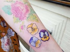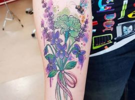 Найчастіше фіалку в татуюваннях зображують в кольоровому реалізмі. Через форми пелюсток вона впізнавана і в чорно-білому реалізмі, все ж ніжніше і витонченіше виглядає в кольорі. Наприклад, цікаво буде виглядати ця ідея в стилі акварель.