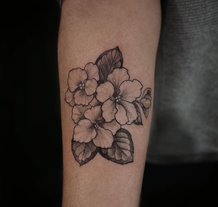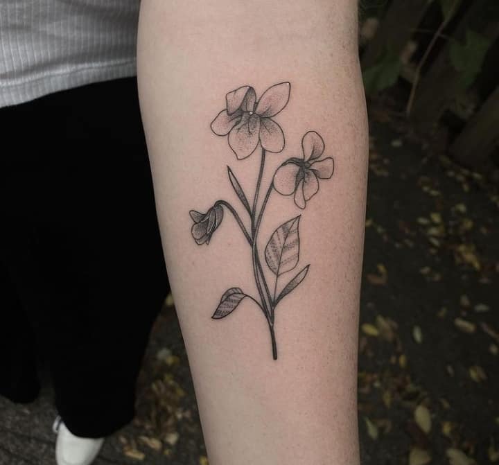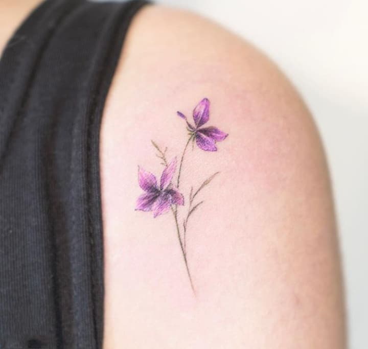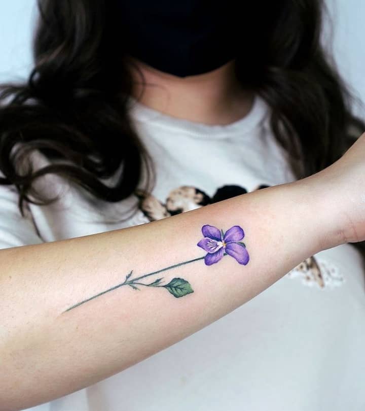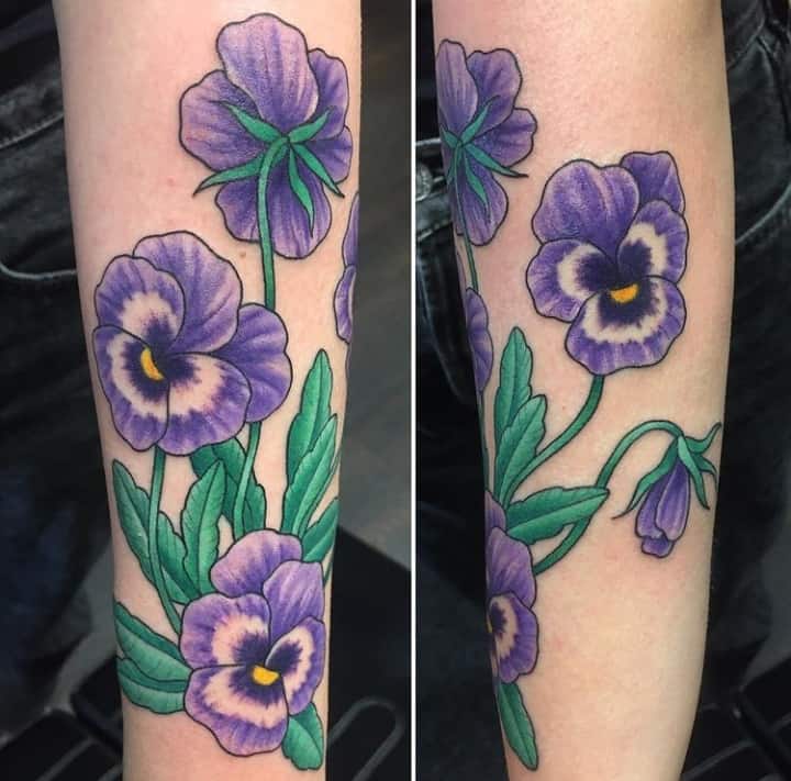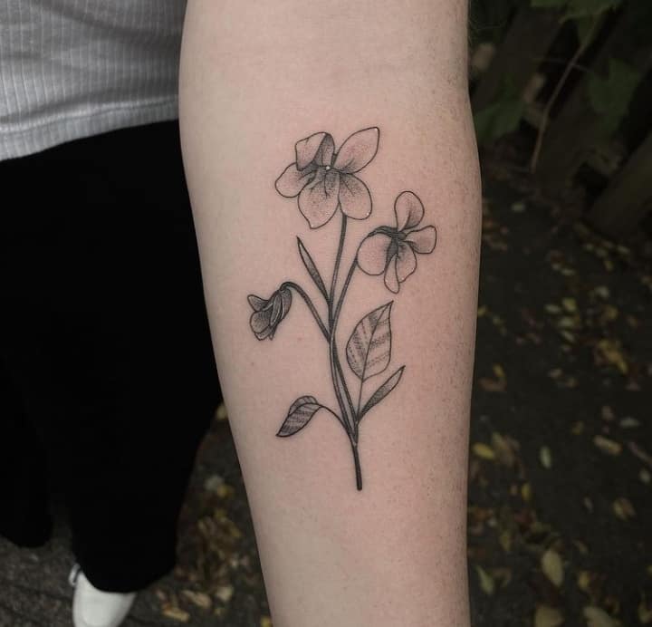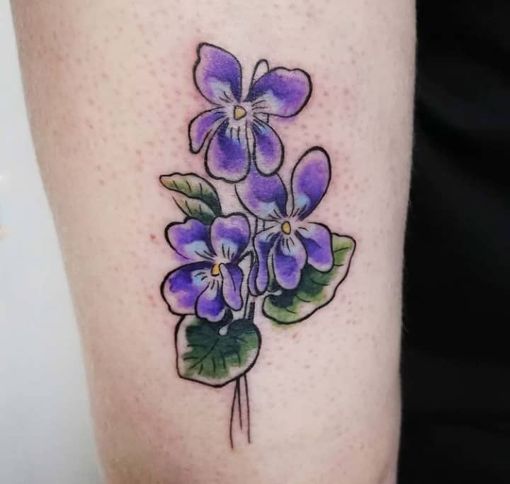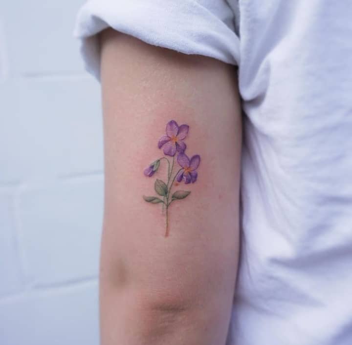 Найчастіше фіалку в татуюваннях зображують в кольоровому реалізмі. Через форми пелюсток вона впізнавана і в чорно-білому реалізмі, все ж ніжніше і витонченіше виглядає в кольорі. Наприклад, цікаво буде виглядати ця ідея в стилі акварель.