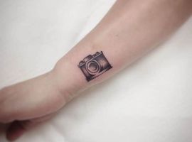 У татуюваннях образ фотоапарата може бути виконаний абсолютно по-різному. Це може бути символічне чорно-біле маленьке зображення, яке не буде призначене вражати погляди оточуючих, воно буде особисте тільки для свого власника.