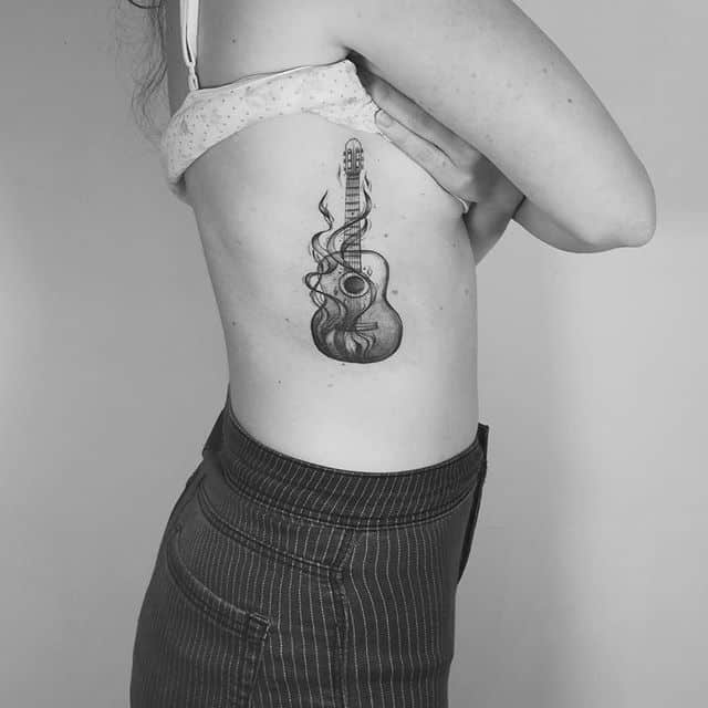 Ще один незвичайний спосіб висловити творчу натуру – це гітара з зірками або багаттям. Таке татуювання підкреслить те, що людина без розуму від подорожей, що їй важливо жити в гармонії з собою і навколишнім світом.
