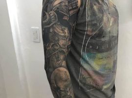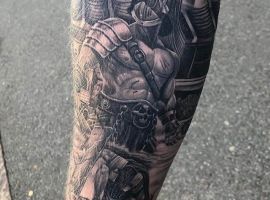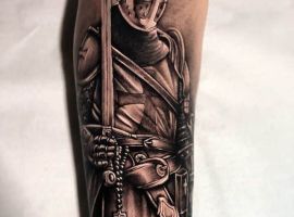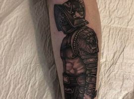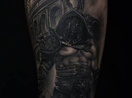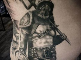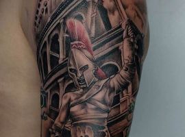 Війна, битва, зброя – популярні теми для чоловічих тату. Воїна гладіатора можна нерідко зустріти на тілі чоловіка хороброго, що поважає себе, сильного і того, який точно знає, чого він хоче від життя. Виглядають татуювання Гладіатор, як буде видно по фото, дуже цікаво і небанально. Професійні майстри можуть відобразити гладіатора ніби безпосередньо в момент бою, що, безсумнівно, виглядає приголомшливо.