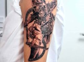 Гладіатор – це раб-воїн, який бився на арені амфітеатру. Це борець за власне життя, якому нічого не залишається, крім як битися, щоб вижити. Але гладіатор міг бути не тільки рабом, а й злочинцем. «Приречених» чоловіків вчили користуватися мечами, щоб в подальшому вони вбивали один одного на сцені для того, щоб «розвеселити» народ. Варто розуміти, що татуювання Гладіатор НЕ буде однозначним. Така тату на тілі одночасно як позитивна, так і негативна. З одного боку, гладіатор – це людина, що показала небувалу силу, міць і відвагу. З іншого боку – це приречена на смерть людина, адже зазвичай сутичка закінчувалося лише при смерті одного з учасників. Переможця довго вихваляли, іноді дарували свободу …