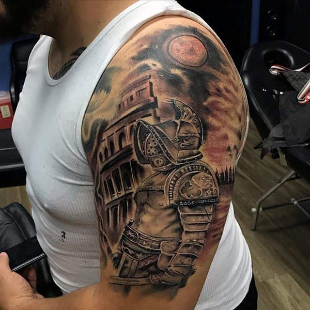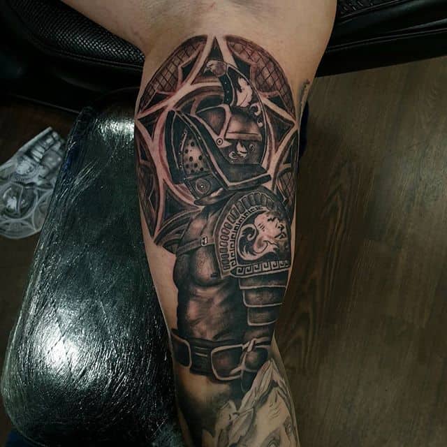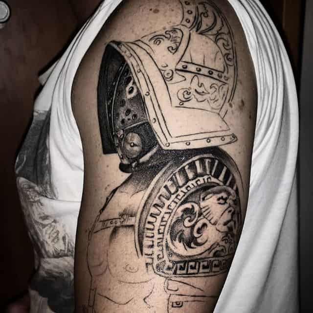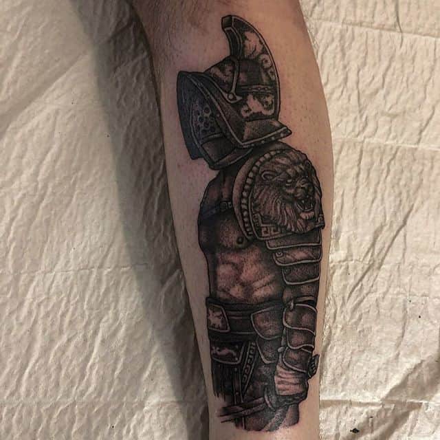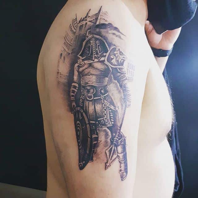 Досить часто можна побачити наколку гладіатора на грудях, на нозі або на плечі. Такий малюнок дозволить похвалитися міцним і м’язистим тілом.