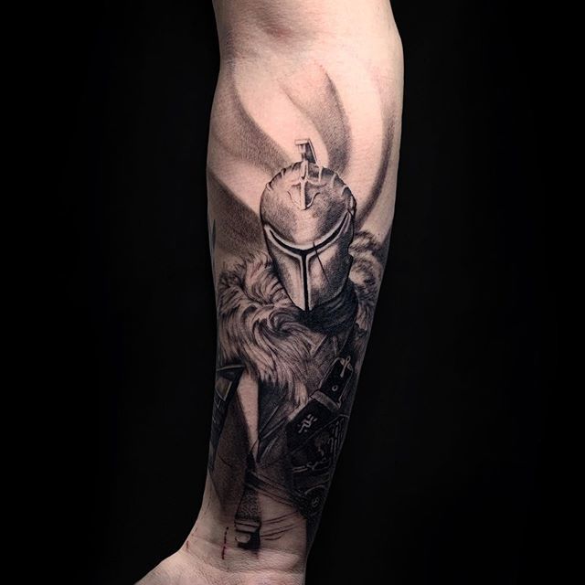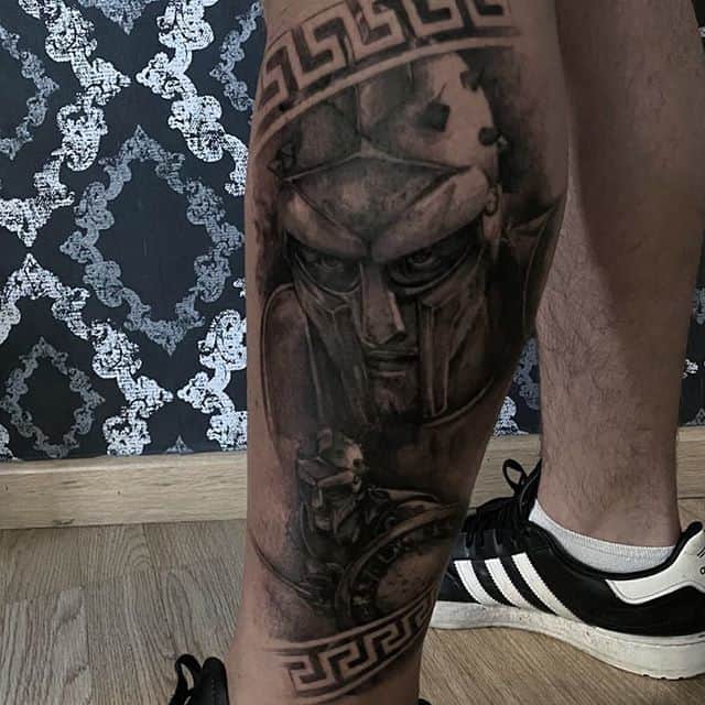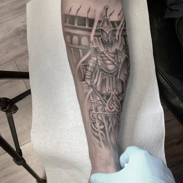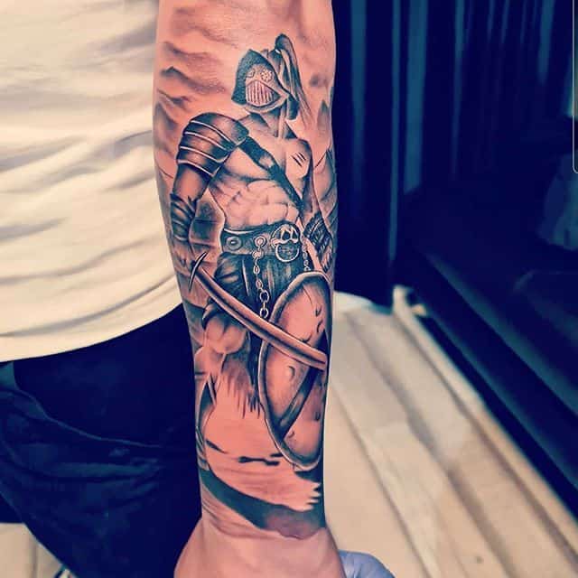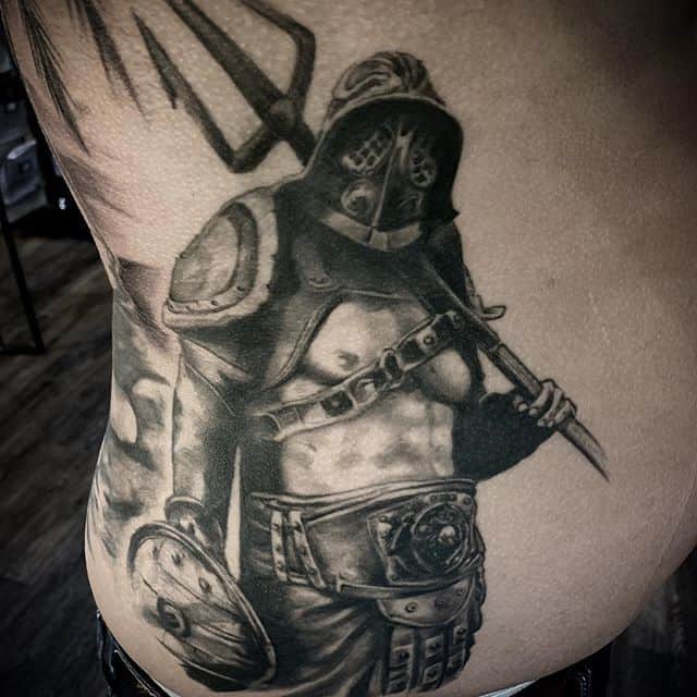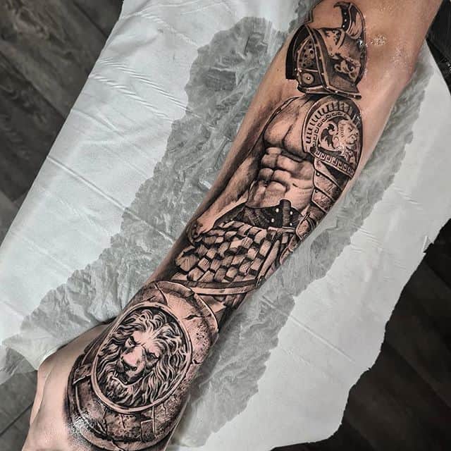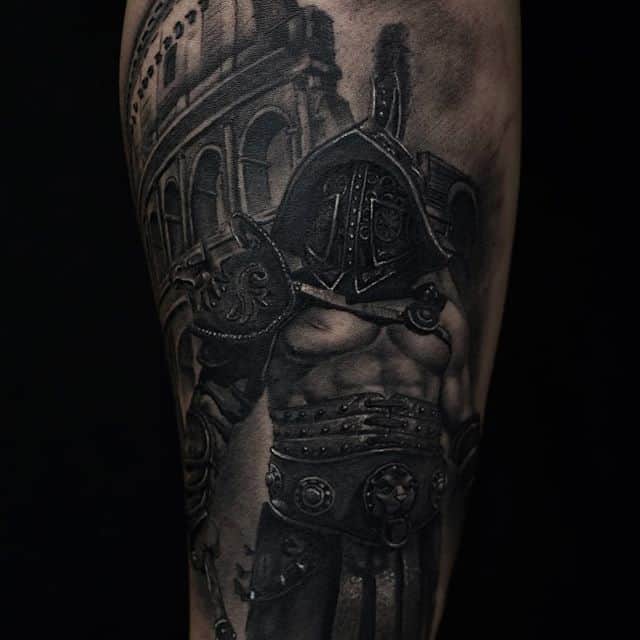 Татуювання графіка теж виглядають приголомшливо. Це деталізована картинка в чорно-білій колірній палітрі. На фото видно, як красиво виглядає не тільки зображення самого гладіатора, а й його меч, щит.