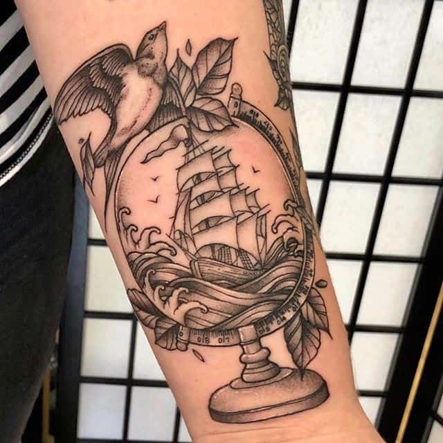 Досить часто зображення з глобусом комбінують з іншими цікавими деталями. Це може бути карта, як знак того, що людина хоче побачити все в світі. Або ж компас – особистість завжди спрямована на пошуки нового. Корабель з уривком карти або глобусом – теж гарний сюжет, що говорить про любов до далеких подорожей. Також глобус може зображуватися на тлі природних пейзажів, з квітами, з космічними елементами (сузір’ями).