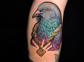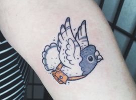 Одна з найпопулярніших татуювань – це голуб. Татуювання голуб буде асоціюватися з любов’ю, мудрістю і добром. Такі малюнки стають і своєрідним оберегом, який залучає удачу і успіх. Підійде татуювання як для дівчат, так і для хлопців. Звичайно, сенс буде дещо змінюватися в залежності від стилю виконання. Наприклад, птах, виконаний в стилі треш-полька з агресивні елементами, навряд чи буде вказувати на доброту і співчутливість її власника.