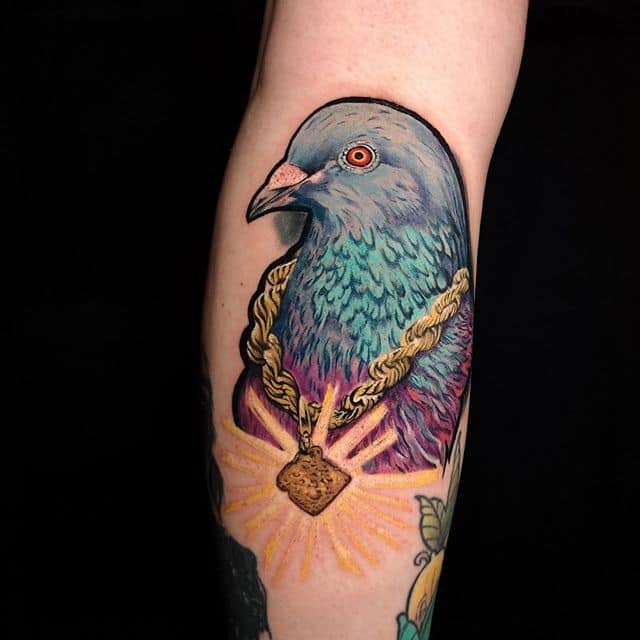 Одна з найпопулярніших татуювань – це голуб. Татуювання голуб буде асоціюватися з любов’ю, мудрістю і добром. Такі малюнки стають і своєрідним оберегом, який залучає удачу і успіх. Підійде татуювання як для дівчат, так і для хлопців. Звичайно, сенс буде дещо змінюватися в залежності від стилю виконання. Наприклад, птах, виконаний в стилі треш-полька з агресивні елементами, навряд чи буде вказувати на доброту і співчутливість її власника.