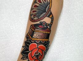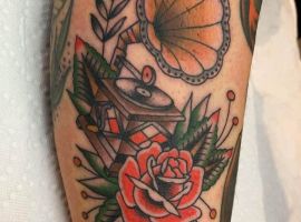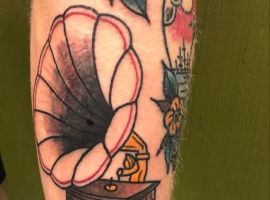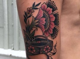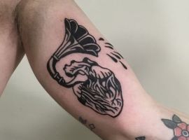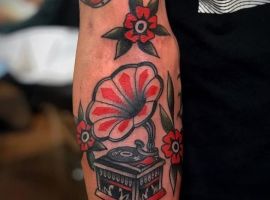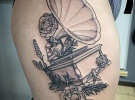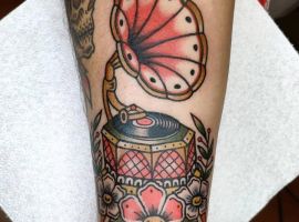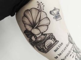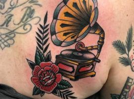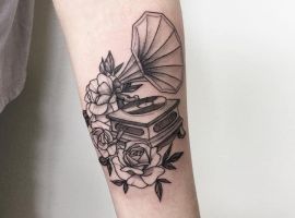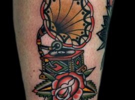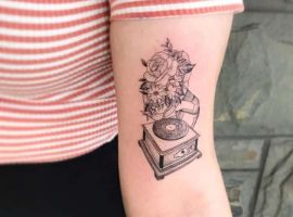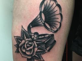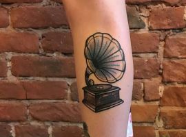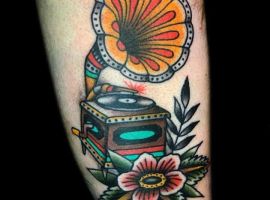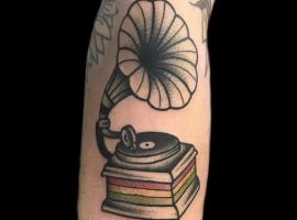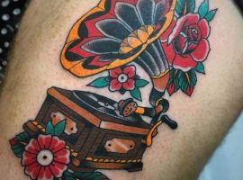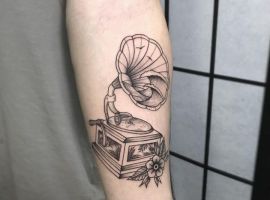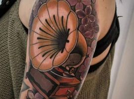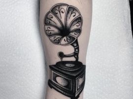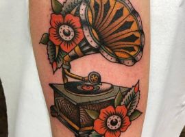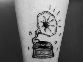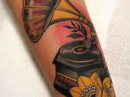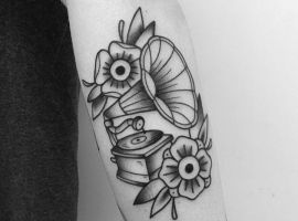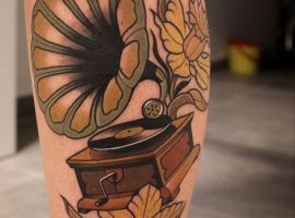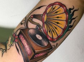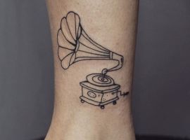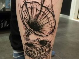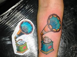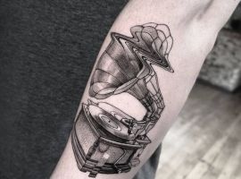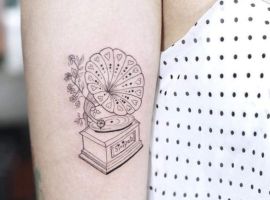 Музичні татуювання – це спосіб висловити те, наскільки дорога людині музика. Досить часто любителі тату вибирають ескізи зі скрипковими ключами, гітарами, ноти, платівки. Також часто набивають назви музичних груп, імена артистів, логотипи певних лейблів. Але якщо хочеться чогось незвичайного, то можна придивитися до ескізів грамофон татуювання або патефон.
