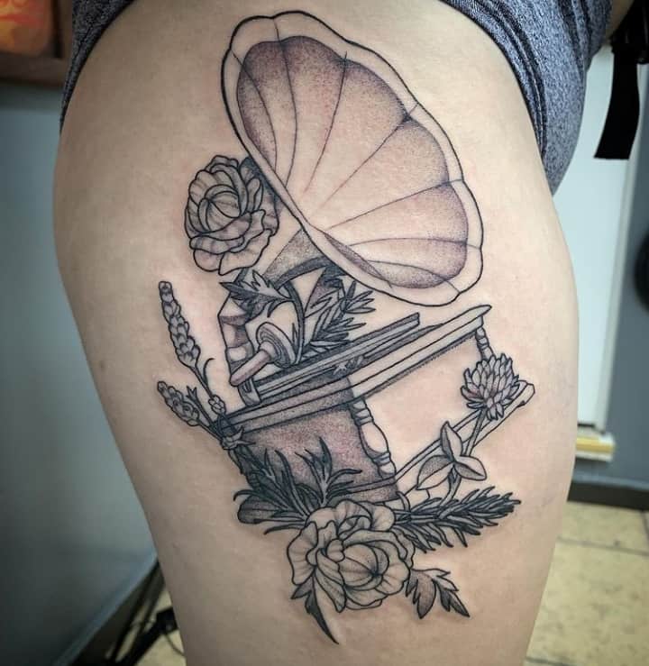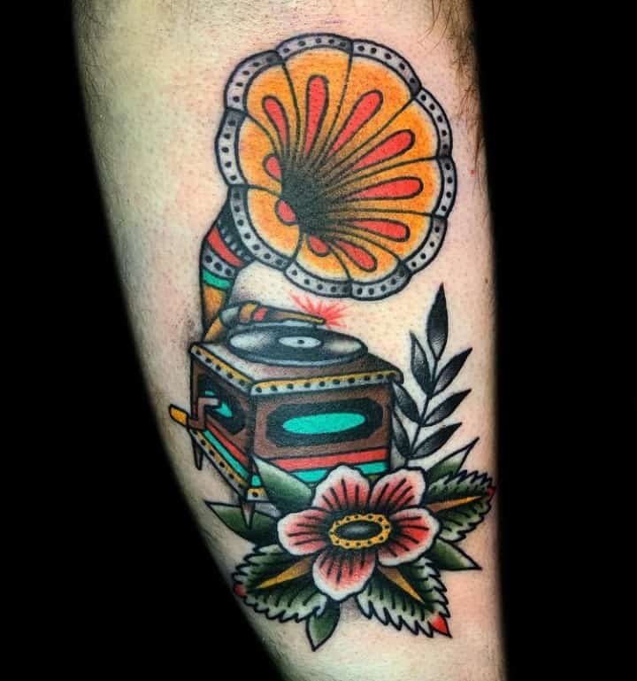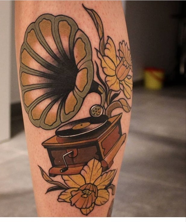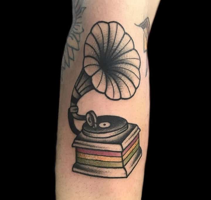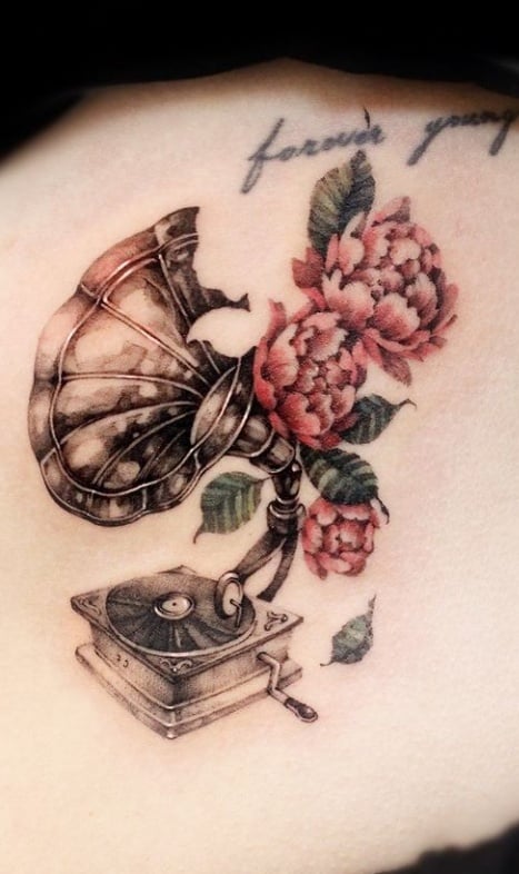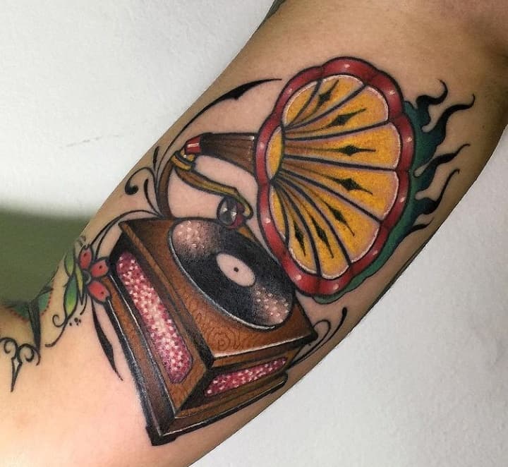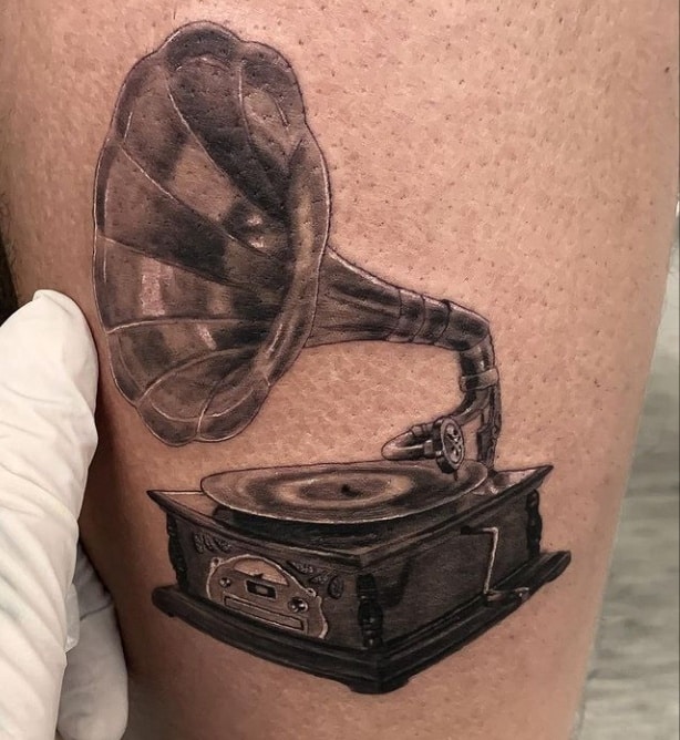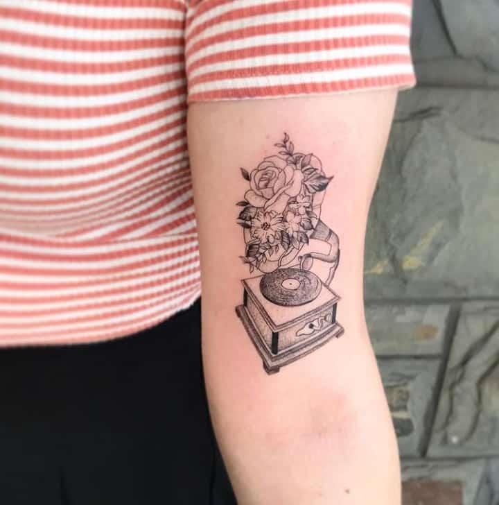 Музичні татуювання – це спосіб висловити те, наскільки дорога людині музика. Досить часто любителі тату вибирають ескізи зі скрипковими ключами, гітарами, ноти, платівки. Також часто набивають назви музичних груп, імена артистів, логотипи певних лейблів. Але якщо хочеться чогось незвичайного, то можна придивитися до ескізів грамофон татуювання або патефон.
