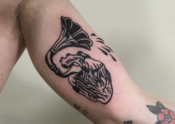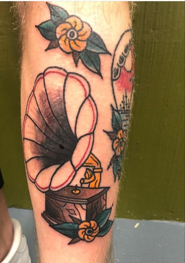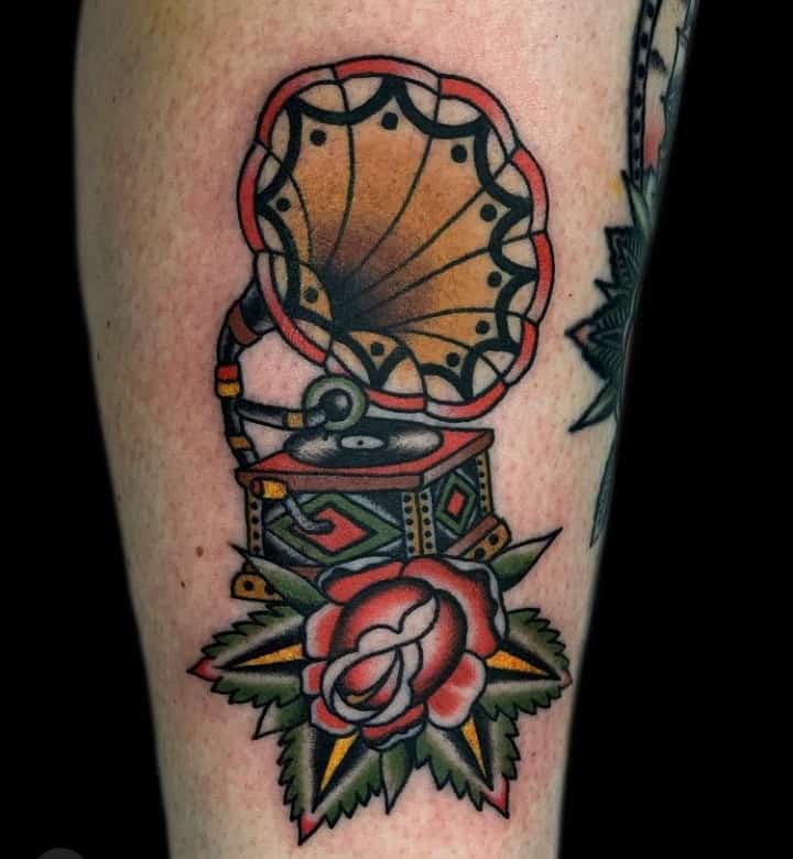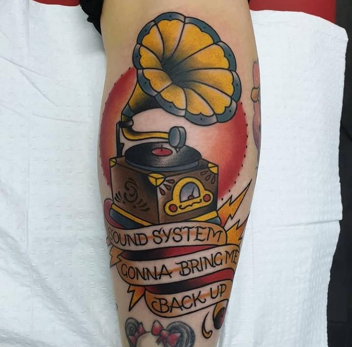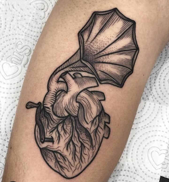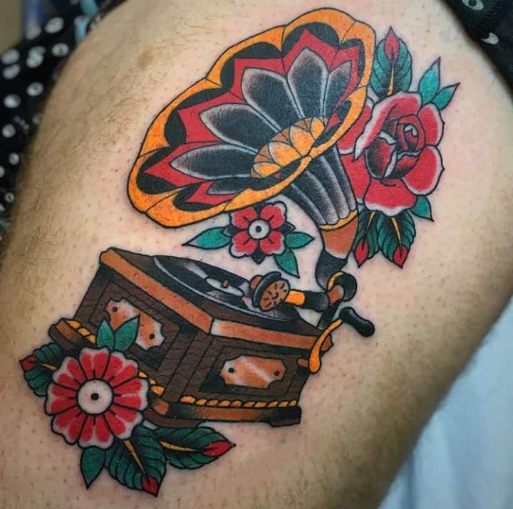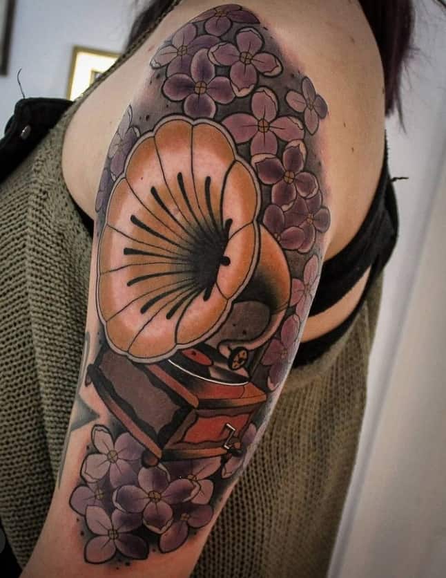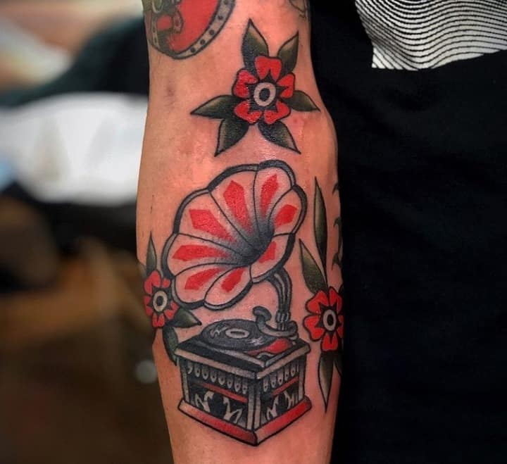 Музичні татуювання – це спосіб висловити те, наскільки дорога людині музика. Досить часто любителі тату вибирають ескізи зі скрипковими ключами, гітарами, ноти, платівки. Також часто набивають назви музичних груп, імена артистів, логотипи певних лейблів. Але якщо хочеться чогось незвичайного, то можна придивитися до ескізів грамофон татуювання або патефон.