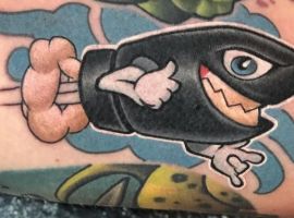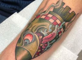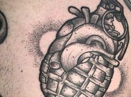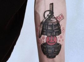 Як видно на фото татуювання з гранатами і бомбами можуть бути виконаними навіть в мультиплікаційному стилі. У будь-якому випадку потрібно детальне опрацювання кожного елемента. Наші майстри салону Альянс в Києві не тільки чудово впораються з завданням, а й намалюють індивідуальний ескіз з урахуванням всіх побажань.