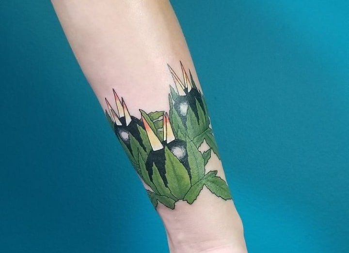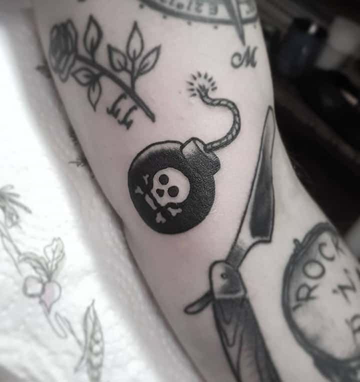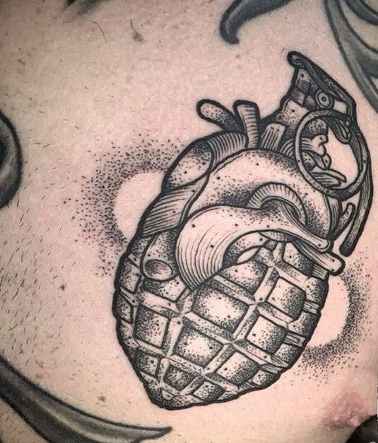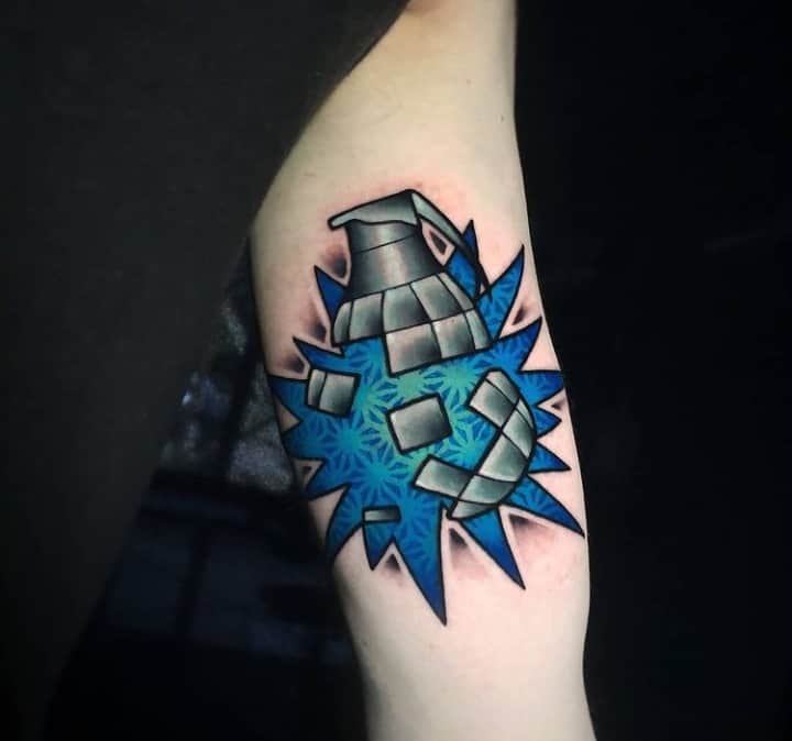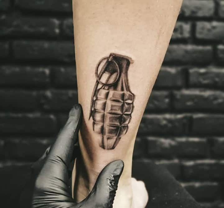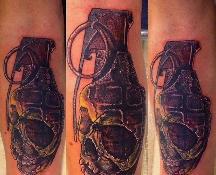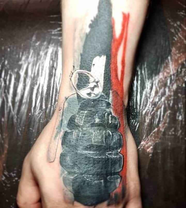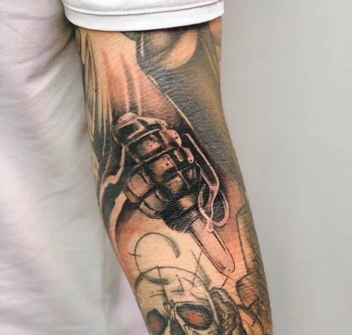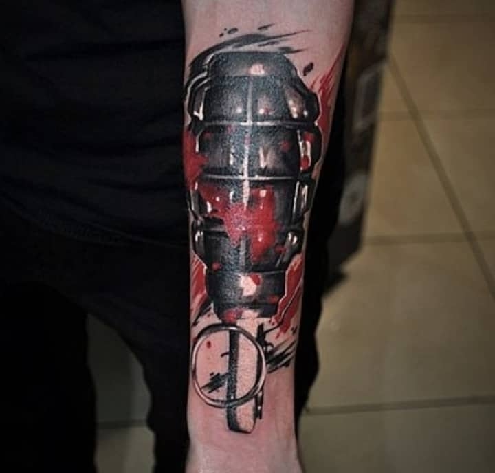 Тема татуювань з різною зброєю стрімко набирає популярність. Цікаво виглядає татуювання граната, вибухівка, при цьому вони можуть бути як самодостатнімі малюнками, так і доповнювати або поєднуватися з іншими елементами.