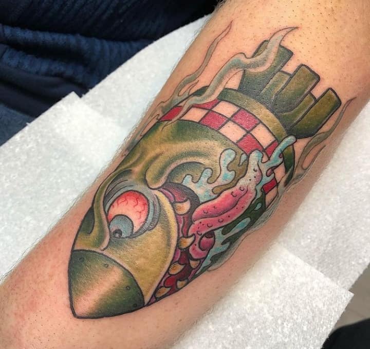 Як видно на фото татуювання з гранатами і бомбами можуть бути виконаними навіть в мультиплікаційному стилі. У будь-якому випадку потрібно детальне опрацювання кожного елемента. Наші майстри салону Альянс в Києві не тільки чудово впораються з завданням, а й намалюють індивідуальний ескіз з урахуванням всіх побажань.