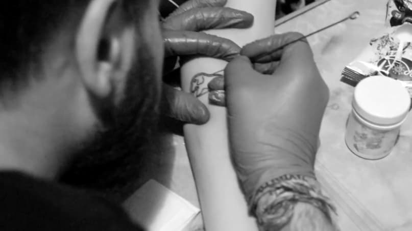 Дослівний переклад слова handpoke – ручне нанесення. Термін утворений двома англійськими словами “hand” – рука і “poke” – робити отвір. Переклад найкраще відображає суть техніки. Тату хендпоук наноситься вручну голкою. Ніяке професійне обладнання не використовується.
