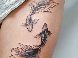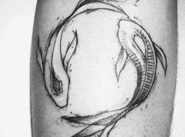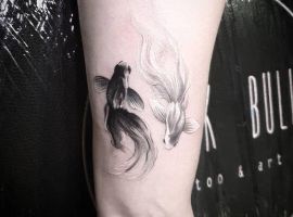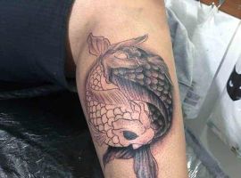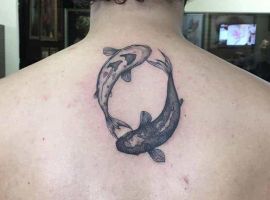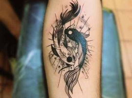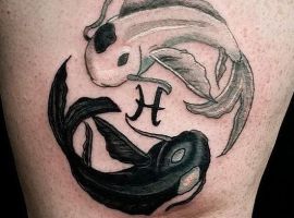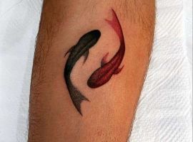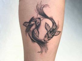 Інша варіація представлена рибами, найчастіше – коропами які, зображуються в різних кольорах, найчастіше – чорно-білий і синьо-жовтий. Дві половинки – самка і самець, уособлюють віру, твердість, везіння, моральний розвиток. Плаваючи разом, вони створюють баланс двох різних Енергетик. У татуюванні плавання риб Коі по колу відсилає до того, що все в світі взаємопов’язано.