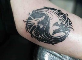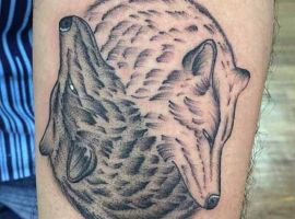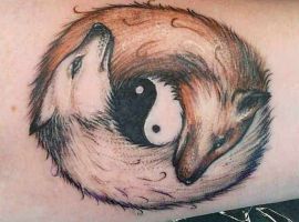 Цікавий варіант розгляду подвійності устрою світу. Тату, на якому зображено два вовка: чорний і білий. Це один з найоригінальніших і незвичайних втілень Інь Ян.