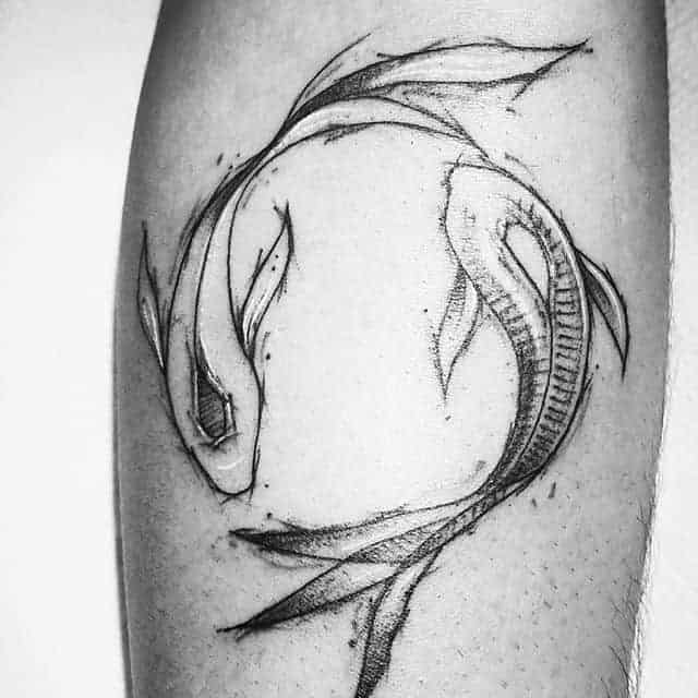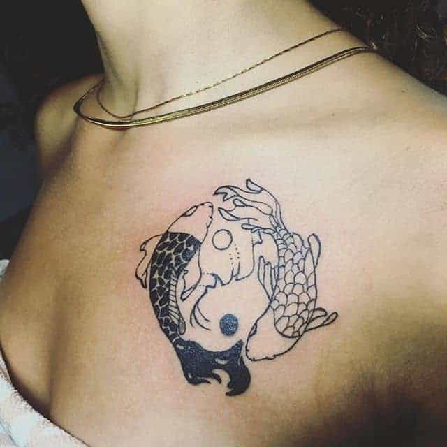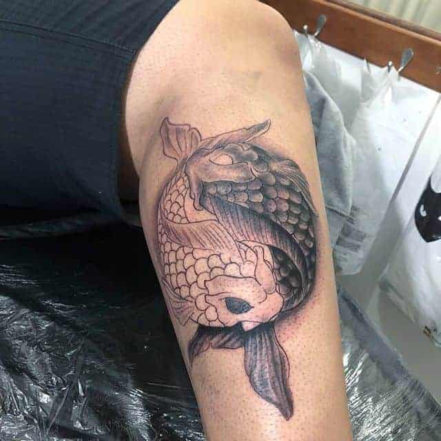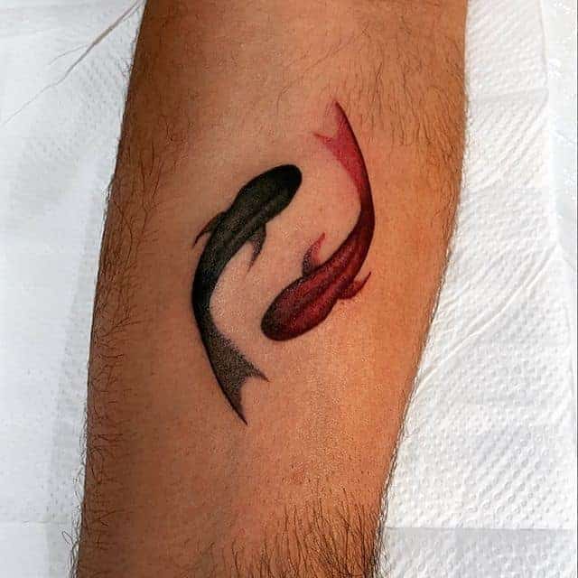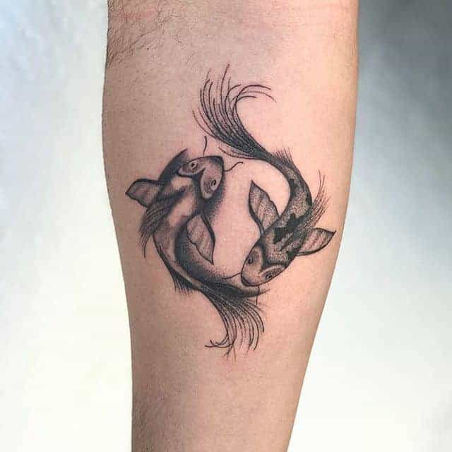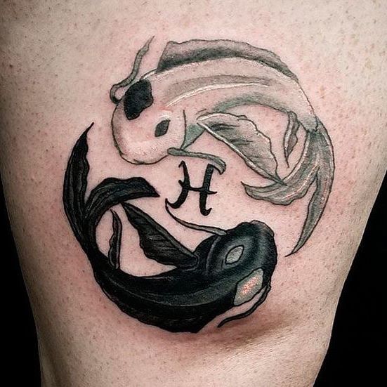 Інша варіація представлена рибами, найчастіше – коропами які, зображуються в різних кольорах, найчастіше – чорно-білий і синьо-жовтий. Дві половинки – самка і самець, уособлюють віру, твердість, везіння, моральний розвиток. Плаваючи разом, вони створюють баланс двох різних Енергетик. У татуюванні плавання риб Коі по колу відсилає до того, що все в світі взаємопов’язано.