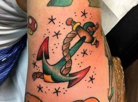 - Тату акула з якорем. Акула – символ безстрашності у людей, пов’язаних з морем. Найчастіше це поєднання набивають моряки, рибалки і капітани далекого плавання.