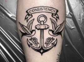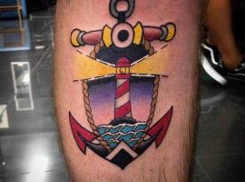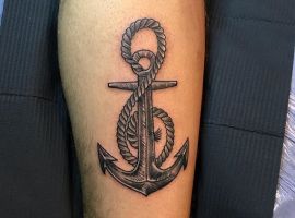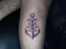 - Кермо, обвите канатом, з якорем на кінці. Означає, що, незважаючи на авантюрну натуру, людина готова зупинитися. Виглядає таке тату якір на нозі особливо ефектно.