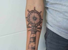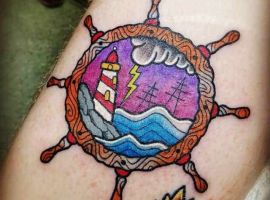 - Тату штурвала з маяком всередині. Означає досягнення мети. Таке зображення набивають люди, впевнені, що їхні плани збудуться.