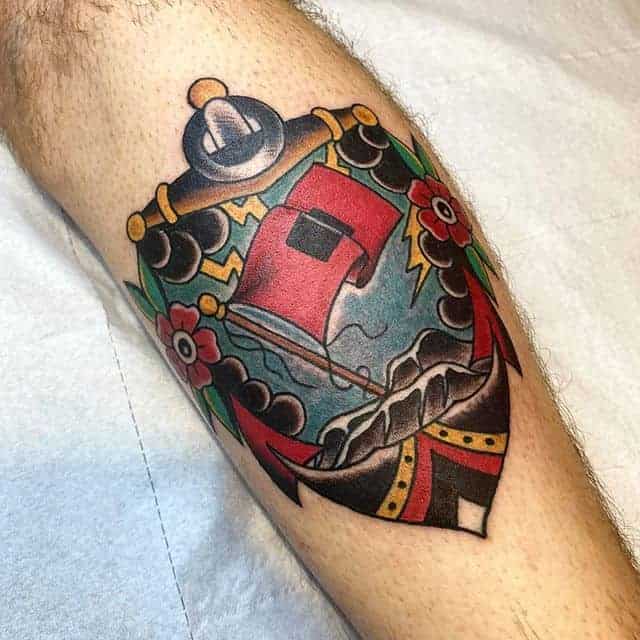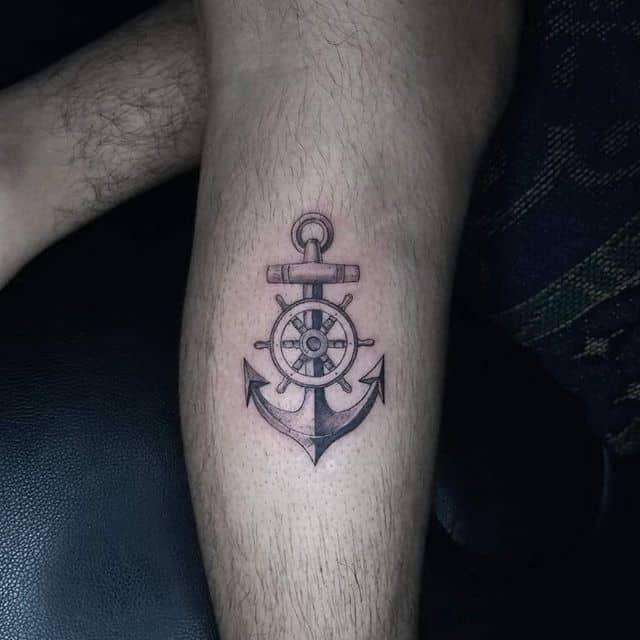 - Кермо, обвите канатом, з якорем на кінці. Означає, що, незважаючи на авантюрну натуру, людина готова зупинитися. Виглядає таке тату якір на нозі особливо ефектно.