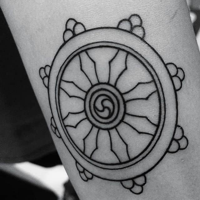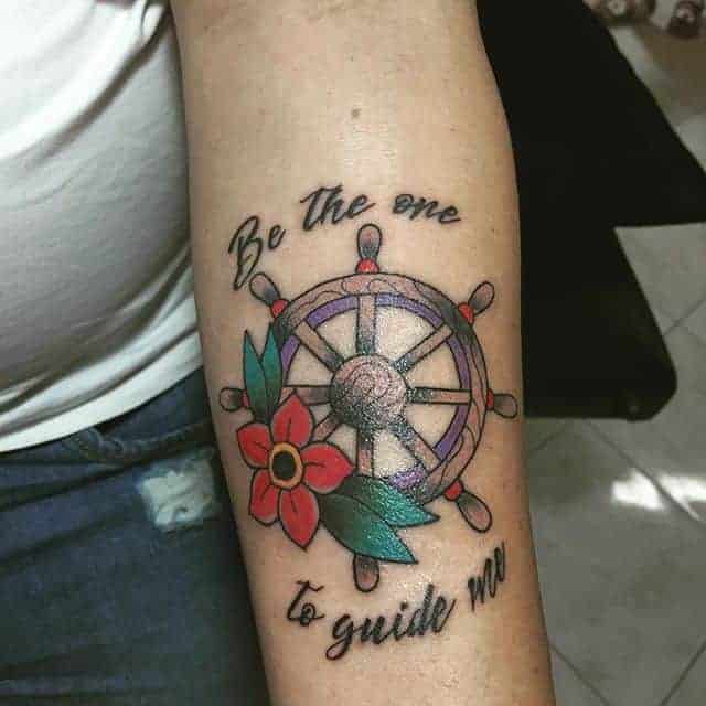 Символ штурвала означає, що людина, яка вирішила його набити, є господарем свого життя і нікому не дозволить вказувати, як їй чинити в тій чи іншій ситуації. Таку ідею набивають лідери.