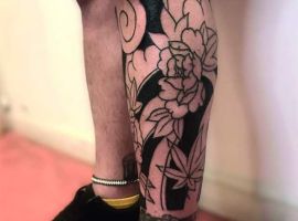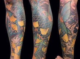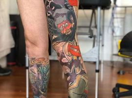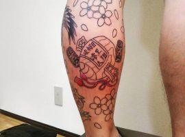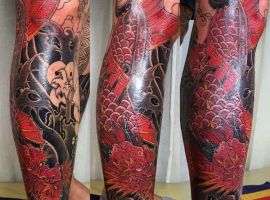 Японські татуювання на нозі – це зазвичай масштабні картини зі складним сюжетом. Вони яскраві, включають зображення тварин, квітів. Часто поєднуються кілька символів. Порожні місця між ними заповнюються візерунками або орнаментом.