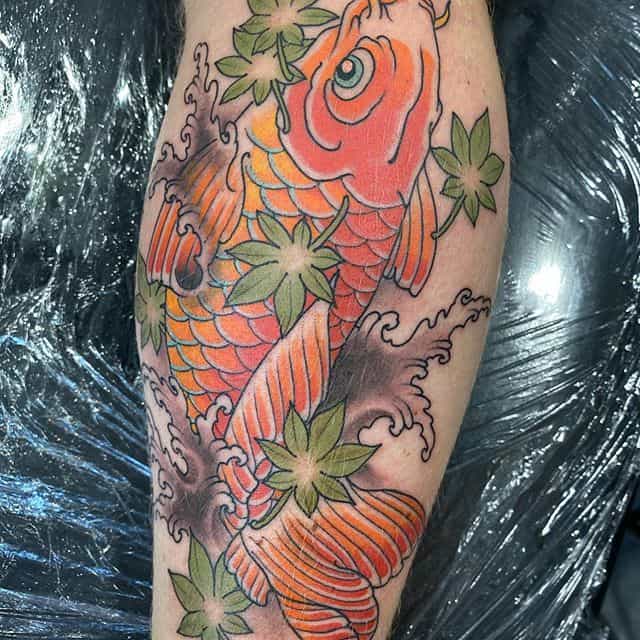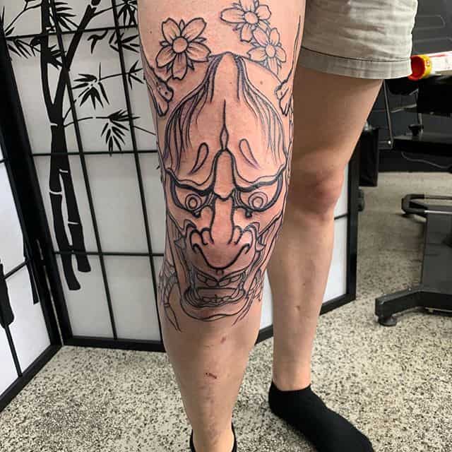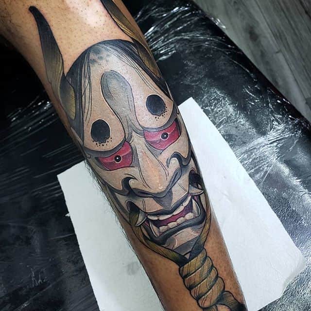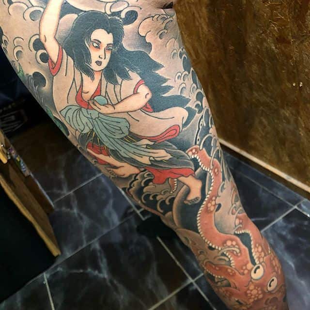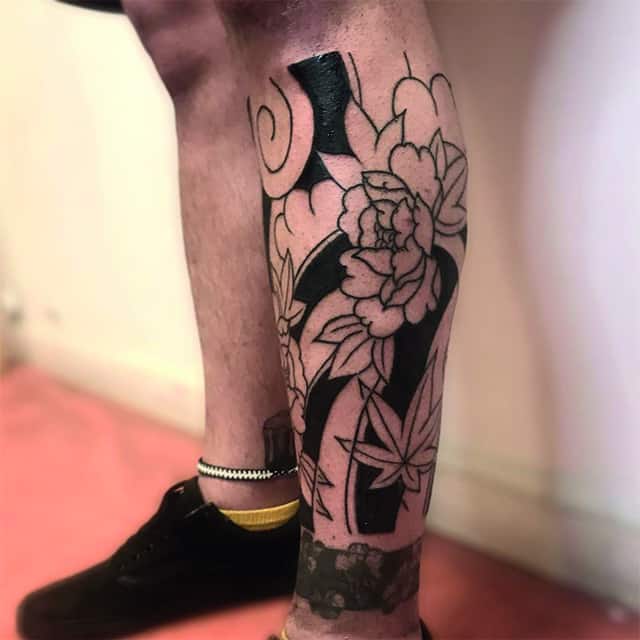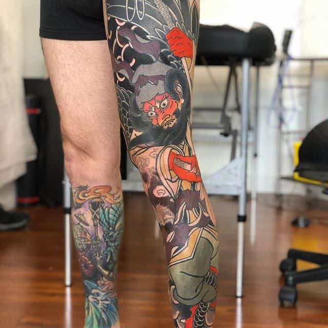 Японські татуювання на нозі – це зазвичай масштабні картини зі складним сюжетом. Вони яскраві, включають зображення тварин, квітів. Часто поєднуються кілька символів. Порожні місця між ними заповнюються візерунками або орнаментом.