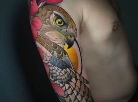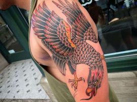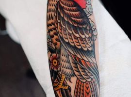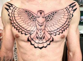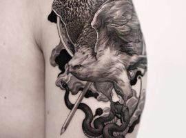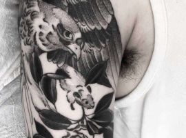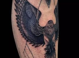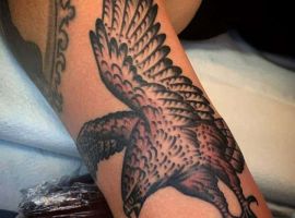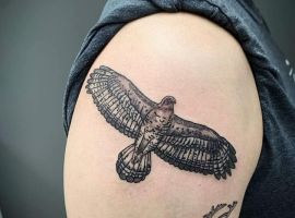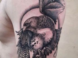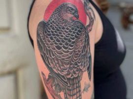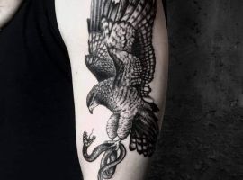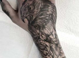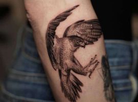Не обов’язково повністю робити тату з фотографічною точністю, але важливо передати акцент погляду яструба і динаміку сили цієї дивовижної птиці. З цієї ж причини тату з яструбом рідко зустрічаються в мініатюрах і в прихованих (інтимних) зонах. Яструб – це символ, який несе в собі потужний потенціал і свідчить про силу духу носія, тому найчастіше такі татуювання наносять на плечі, руки, на спину або на груди. Наші майстри салону Альянс в Києві створюють унікальні ескізи на замовлення.