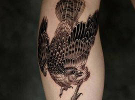 - Ще одна примітна якість яструбиних – це універсальність. Яструб відмінно маневрує і в лісовій гущавині, і здатний колами парити на відкритих просторах. Тату з яструбом свідчить про непохитну волю і про вміння пристосовуватися до мінливих обставин.
