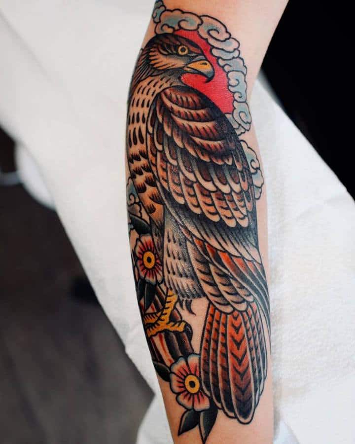 Татуювання з яструбом популярні у військових саме з цієї причини, адже на службі важливі якості не тільки сміливості і хоробрості, але ще і моральної підготовки, непохитної навіть в екстремальних обставинах. Уміння вистояти і приймати героїзм, як норму життя – це невід’ємні складові значення тату з яструбом. Варто згадати, що саме волелюбний і дикий яструб був улюбленим птахом легендарного воєначальника Тамерлана, а сам полководець славився неймовірною відвагою, але при цьому був стриманий і розважливий.