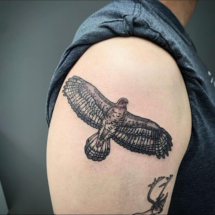 - Ще одна примітна якість яструбиних – це універсальність. Яструб відмінно маневрує і в лісовій гущавині, і здатний колами парити на відкритих просторах. Тату з яструбом свідчить про непохитну волю і про вміння пристосовуватися до мінливих обставин.