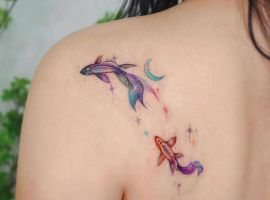 Короп – благородна риба! Її часто виконуюсь в стилях ч / б реалізм або в графіка. Особливе місце серед всіх татуювання короп займають ті, що виконані в східному стилі. Є в них щось привабливе, невловиме і глибоке. Поряд з великими Драконами, білими лотосами і тиграми особливою популярністю користується кольорове татуювання красивого японського коропа Koi так званої також “Парчевий короп”. Цей короп вважається «Імператором риб», йому приписують десятки позитивних значень. В реальності ж цей короп здатний виживати практично при будь-яких умовах. Він може перестрибувати водоспади, плисти і проти течії, боротися за виживання з великими рибами, виношувати потомство навіть в найскладніших кліматичних умовах. Зрозуміло, що і значення японського коропа в татуюванні відповідне: виживання, сила, прагнення досягти мети.